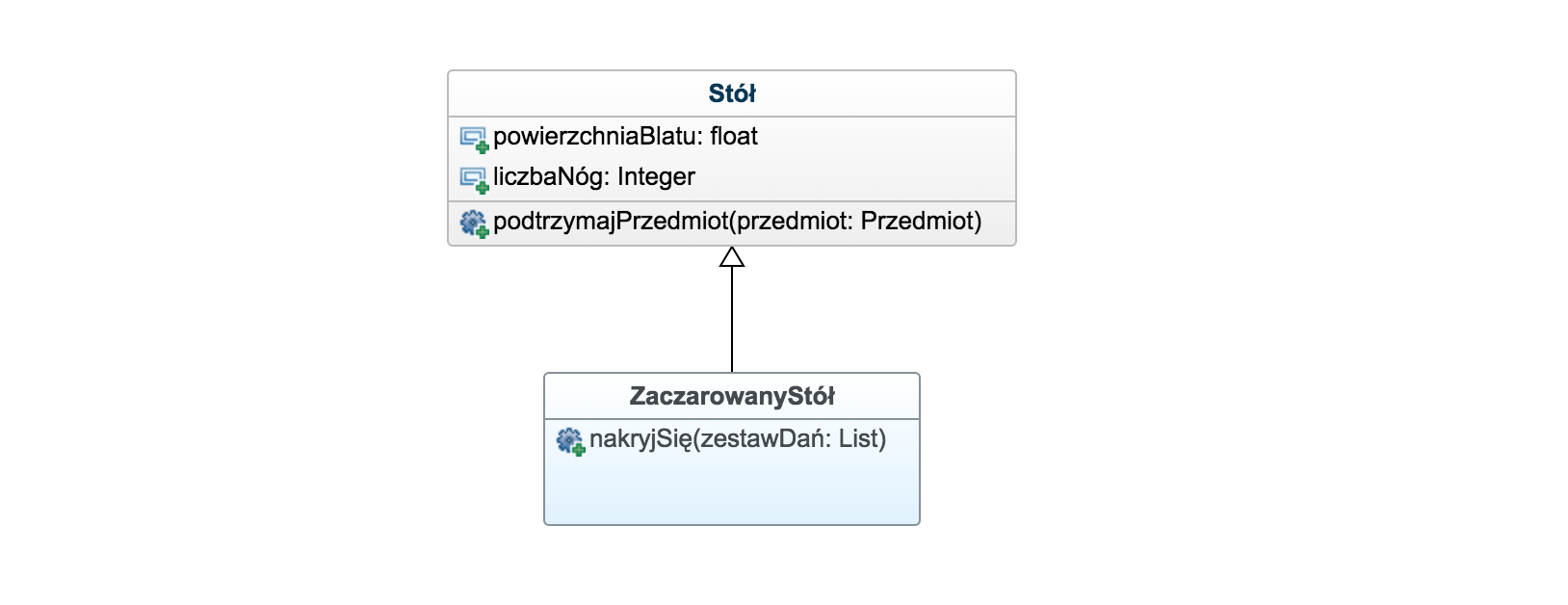 Obiekt klasy ZaczarowanyStół jest "wyposażony" w atrybuty i metody odziedziczone od klasy Stół, a ponadto udostępnia metodę nakryjSię(...).