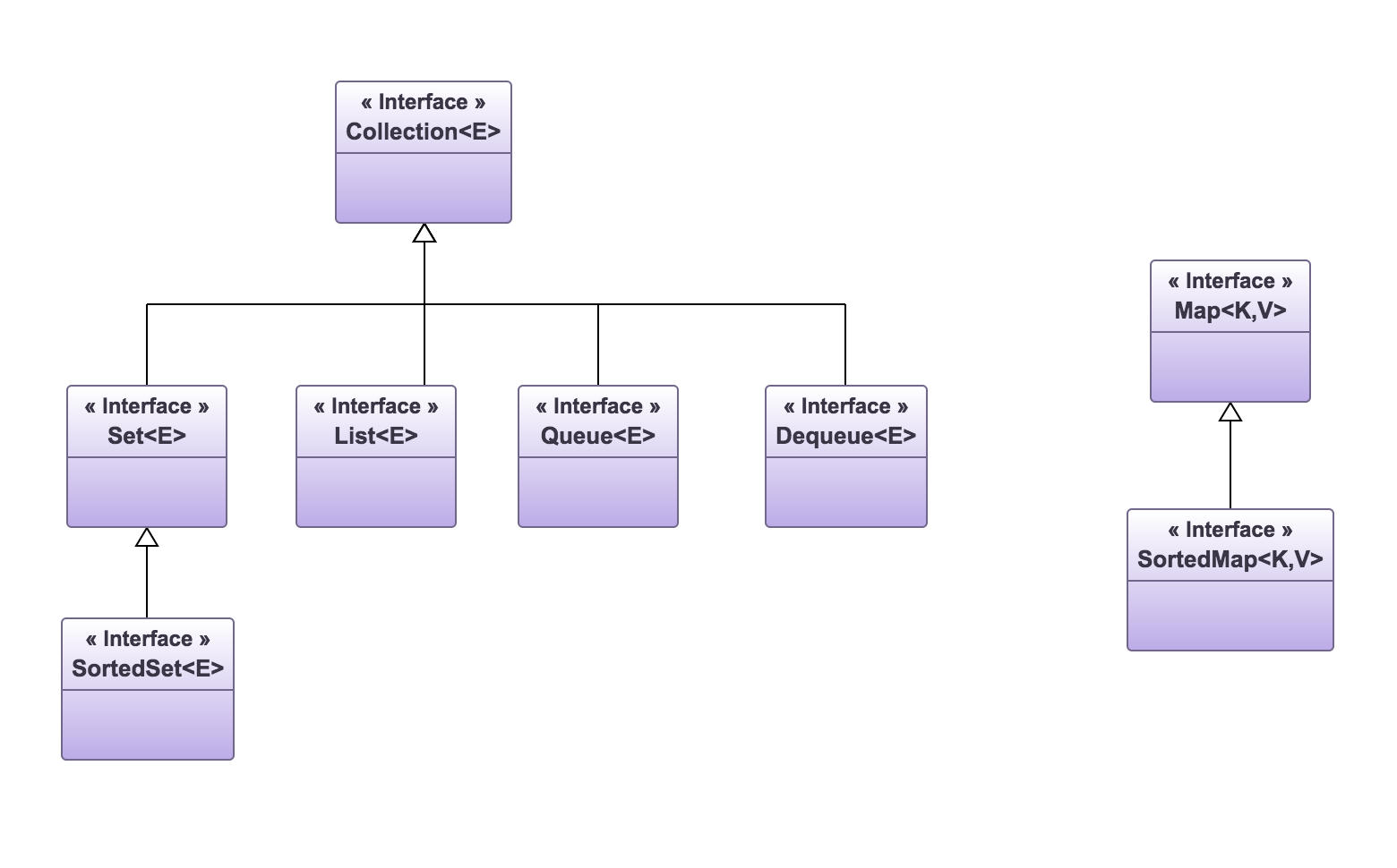 SortedSet— kolekcja typuSet, w której elementy są uporządkowane rosnąco. Dodano w niej kilka metod umożliwiających korzystanie z uporządkowania elementów.SortedMap— kolekcja typuMap, w której odwzorowania są uporządkowane rosnąco według wartości kluczy.