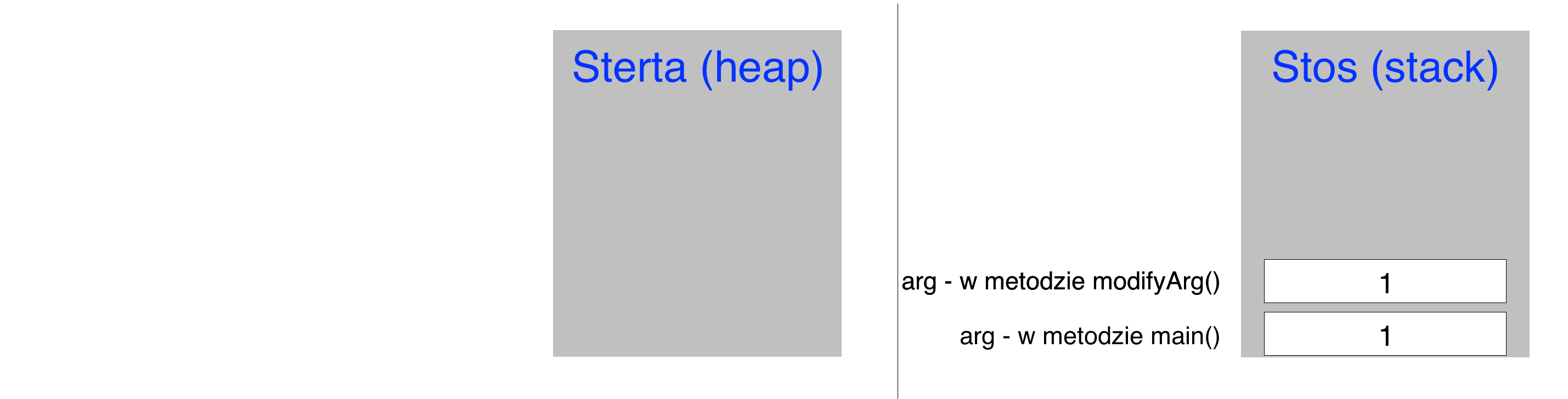 Argument arg zosatał przekazany jako kopia wartości. W chwili wywołania metody SimpleTypeArgumentClass.modifyArg( int arg ) została utworzony na stosie nowa zmienna int arg dla metody modifyArg( int arg). W efekcie modyfikacja wartości tej zmiennej nie wpłynęła na wartość oryginalnej zmiennej arg w metodzie SimpleTypeArgumentClass.main.